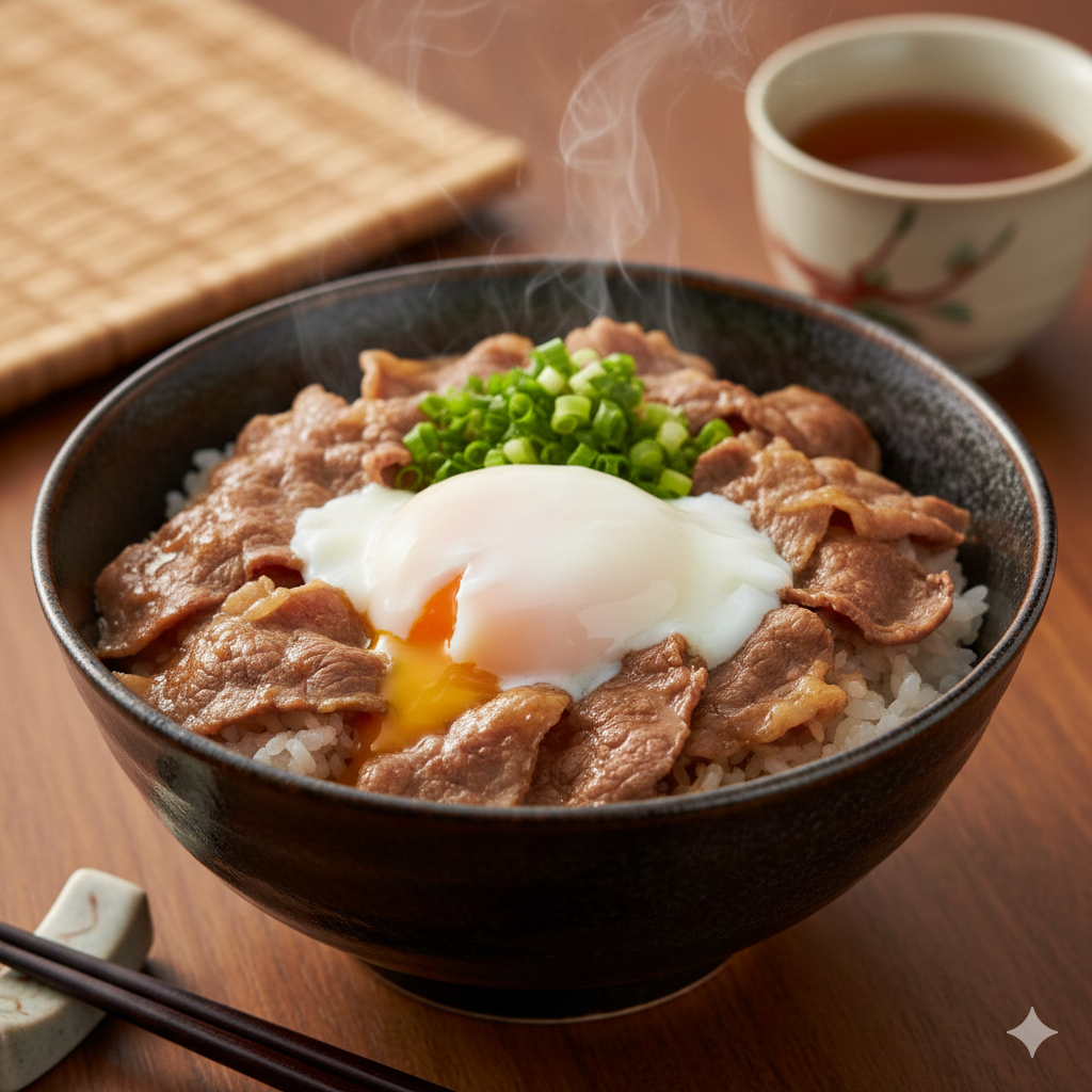Fill your bowls with warm rice. Pour a generous amount of sauce over the rice, then top with the beef and onions. Crack the Onsen Tamago into the center and finish with a sprinkle of green onions.