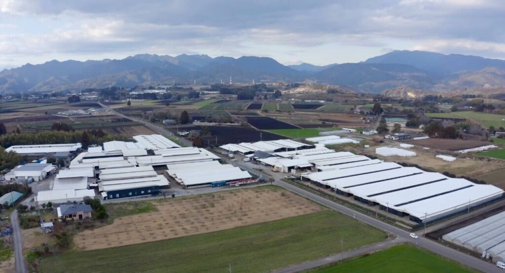 The barns at Arita Farm are situated within expansive grassland and designed with an emphasis on ventilation and natural light.